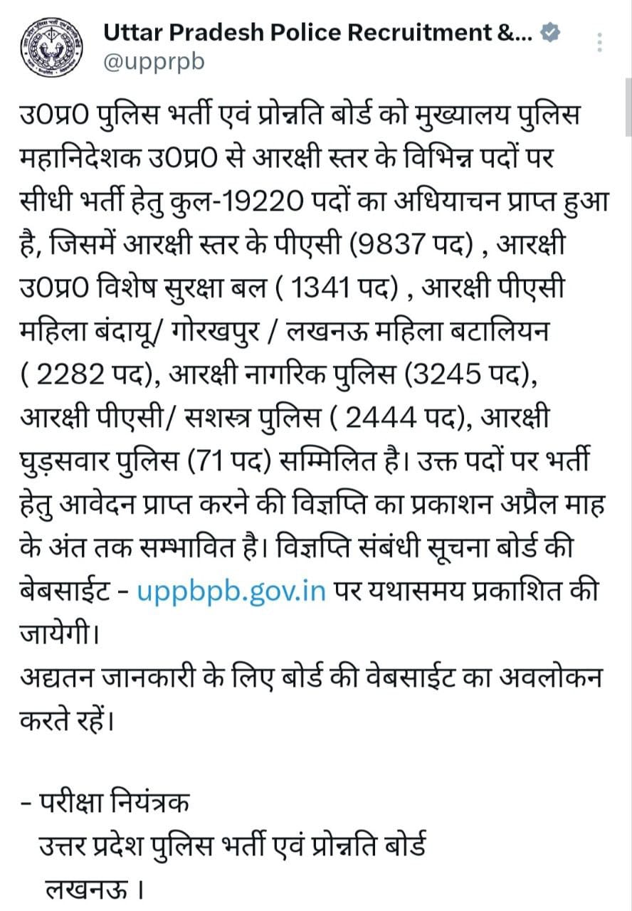 Uttar Pradesh Police Recruitment and Promotion Board (UPPRPB), has received approval to recruit 19,220 constable positions. The official notification is expected by April-end 2025. Candidates should visit the official website (uppbpb.gov.in) regularly for updates.